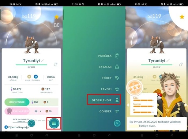 Pokemonları değerlendirmek için yakaladığınız pokemon ekranında üç çizgi butonuna basın. Açılan sekmelerden Değerlendir kısmına tıklayın. Pokemonun kalitesini gösterecektir. 3 yıldızın olduğu simge sarı değilde pembe ise bu en kaliteli pokemon anlamını taşır.