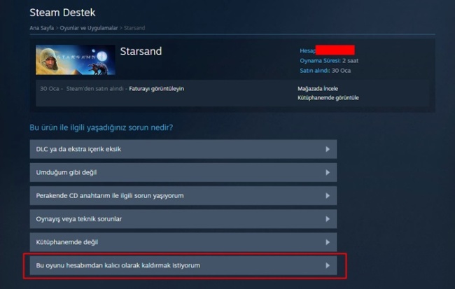 Detaylı görüntülediğinizde "Bu oyunu hesabımdan kalıcı olarak kaldırmak istiyorum" butonuna tıklayınız.