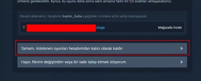 Tamamen silmeden önce Steam son kez size fikrinizi değiştirmek için bir şans tanıyor. Burada eğer kararınızda eminseniz "Tamam, listelenen oyunları hesabımdan kalıcı olarak kaldır" butonuna basarak kütüphanenizden ve hesabınızdan kalıcı olarak kaldırabilirsiniz.
